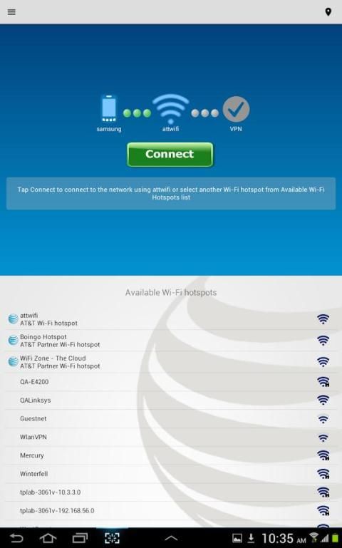 وAT & T الشبكة العالمية العميل لالروبوت، جنبا إلى جنب مع AT & T الخدمات مثل ANIRA، AVTS، بنك التسويات الدولية، وMRAS، يمكن وصول VPN لشبكات الشركات، ويوفر الوصول إلى أكثر من 1 مليون AT & T واي فاي النقاط الساخنة في جميع أنحاء العالم.