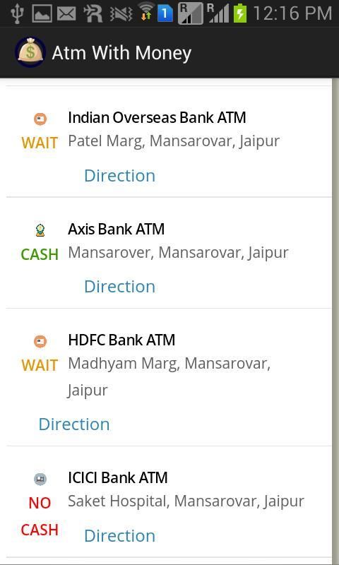 حل واحد لجميع المشاكل المتعلقة المال. لا حاجة للبحث في جميع أنحاء لأجهزة الصراف الآلي امتلاكه. مباشرة اذهبوا إلى أجهزة الصراف الآلي امتلاكه. ويوفر هذا التطبيق تفاصيل عن قريب موقع الصراف الآلي الخاصة بك مع "المال"، "لا مال" و "الانتظار".