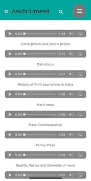 Aakhri Umeed is an online platform and mobile application through which students of Bachelor of Journalism and Mass Communications (BJMC/ BAJMC) can access study material for exams, as well as other topics of interest in the overall global media scenario, through the simple technique of short voice notes. We don't charge money for notes, its absolutely free for you. We don't run ads, so that you can easily browse your voice notes without any interruption at last moment of exams. Contribute to keep this app free for everyone.