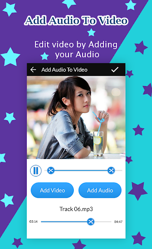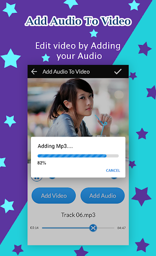 Audio video mixer is one type of video editor app, using this app you can add or mix your favorite audio files to video files. This application manage audio file size if the audio file length is larger than video files, it will be automatically trim audio to video's duration.