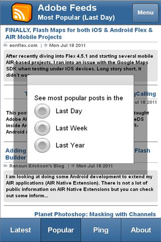 استخدام Adobe Feeds Mobile، يمكنك مواكبة أخبار Adobe المتعلقة بمنتج Adobe تمتد أكثر من 1700 بلوق، والفرز حسب الأكثر شعبية في اليوم الأخير، الأسبوع أو السنة، أو بينغ Adobe Feeds عند تحديث خاصة بكمحتوى بلوق.