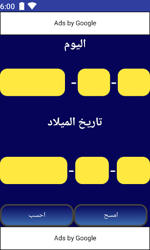 هذا التطبيق يساعدك في حساب عمرك بالأيام والأشهر والسنوات. يعمل التطبيق باستخدام الأسس الأساسية لعملية الطرح. يوجد طرق أخرى لحساب العمر وبالتالي قد تختلف النتائج باختلاف الطريقة
