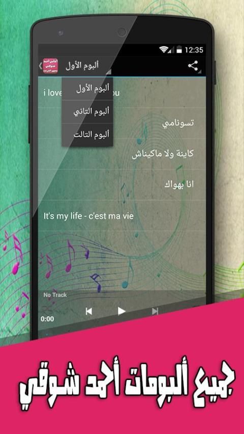 استمعوا الى اغاني أحمد شوقي، بكل سهولة، فقط اضغط على الاغنية التي تريدها وإبدأ الاستماع اليها . حيث يمكنك الاستماع للاغاني في اي مكان بدون الحاجة للانترنت