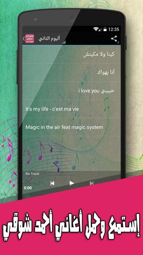 يحتوي التطبيق أغاني أحمد شوقي بدون انترنت 2016 على مجموعة من الاغاني فنان أحمد شوقي
