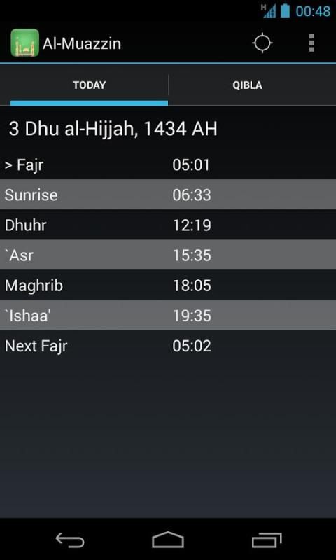 أوقات الصلاة في تطبيق يستخدم بيانات نظام تحديد المواقع والحسابات الفلكية أن تخطر أوقات أوقات الصلاة مسلم. وهو يشمل أيضا البوصلة التي تشير نحو القبلة (الكعبة المشرفة) وتاريخ المقالات من اليوم.