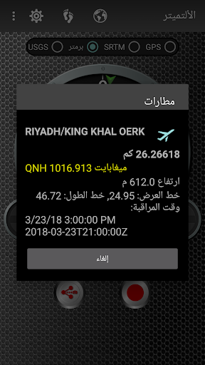 كما يمكن للأجهزة المزودة بمستشعر مقياس الضغط الحصول على ارتفاع الضغط الذي يتم تحويله إلى ارتفاع فوق مستوى سطح البحر. بالنسبة إلى القراءات الأكثر دقة ، قم بمعايرة ارتفاع الضغط عن طريق إدخال قيمة مرجعية أو عن طريق تحديد واحد من قائمة ديناميكية التطبيق لأقرب المطارات. يتم تحديث بيانات المطار عادة كل 20 - 30 دقيقة.