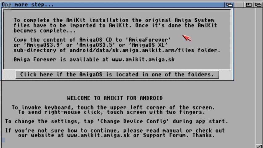 2) You will need Amiga Kickstart ROM 3.1 file to run the emulator. Either install the Amiga Forever Essentials from Google Play OR copy the ROM to android/data/sk.amiga.amikit.arm/files/ROMs folder manually (see PDF for details).