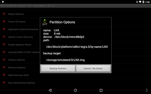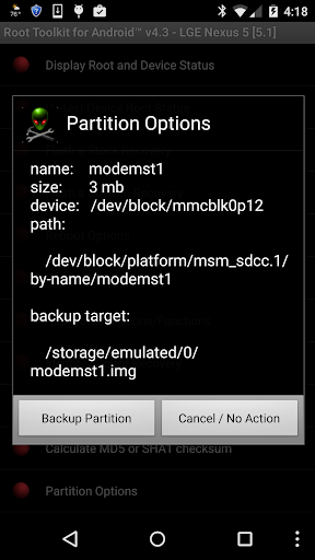 * small (<25mb) partion backup function now supported in v3.9; note: this is NOT meant as a Nandroid backup replacement, but for use in backing-up small, critical partitions that to assist with device recovery; also note that a restore function is NOT included since the target partition is likely to still be open/mounted; useful for backing-up special partitions like EFS.