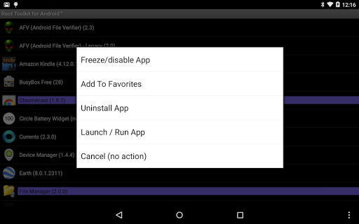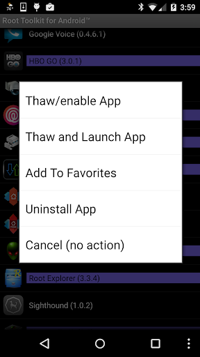 * freeze (disable) or thaw (enable) an application (use caution when freezing a system app!); see Settings menu to enable display of system apps