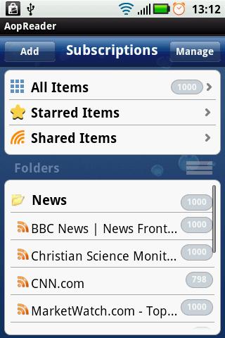 AopReader is a app for Google reader features include:sync with your online Google Readersearch and subscribe to new feeds by keyword. Manage FoldersFeeds conveniently. Marking items as read, starred, shared, keep unread, changing feed39;s folder, and more Bugs fixed.
