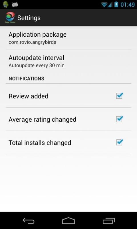 هذه القطعة يسمح لك لتتبع حالة أي تطبيق في السوق. وسيتم إشعارك إذا كان هناك شيء قد تغير في السوق فيما يتعلق بتطبيق المستهدفة. على سبيل المثال، سوف يتم إعلامك إذا أضيف أي شخص استعراضا إلى التطبيق الخاص بك، أو تم تغيير تصنيف للتطبيق. يمكنك تكوين الفاصل الزمني للتحديث من أجل التطبيق المصغر أو تحديث يدويا.