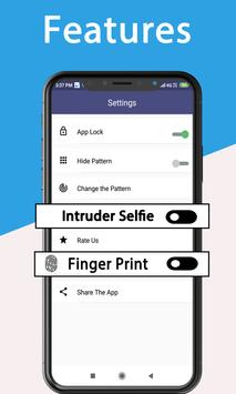 Pattern lock & password lock have many kinds of themes. Pattern lock is more faster to unlock. And the mode of pattern lock, you can hide draw path. Much safer for you to lock apps. Fingerprint lock just presses your fingers on screen, AppLock will scan your fingerprint, then the screen will be unlocked in a second, more convenient to use.