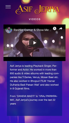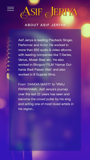 Official Mobile app of Asif Jeriya. Asif Jeriya is leading Playback Singer, Performer and Actor. He worked in more than 850 audio & video albums with leading companies like T-Series, Venus, Moser Baer etc. He also worked in Bhojpuri FILM ‘Hamar Dulhania Badi Paisan Wali’ and also worked in 8 Gujarati films.