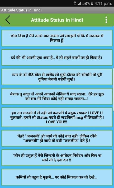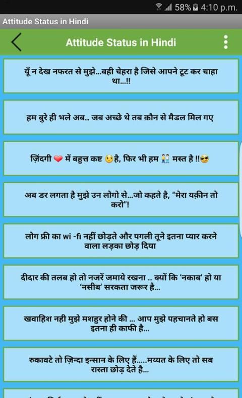 قم بتحميل اصدار رسمي من التطبيقات العربية في 9Apps الآن. 10,000+ مستحدمين يحملون Attitude Status in Hindi احدث الاصدار مجانا كل أسبوع في تتمتع في استخدام هذا التطبيق في الموبايل..9Apps هذه التطبيق الحلوووه تصدر في 2016-04-30 انه تطبيق واسع الانتشار في المنطقة العربية..