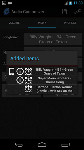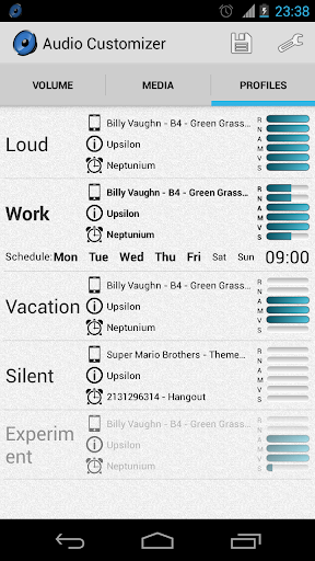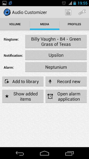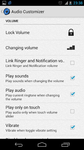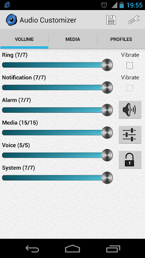 Audio Customizer هو إدارة مستوى الصوت المتقدمة، تتيح لك التحكم في وحدة التخزين وإدارة النغمات على هاتفك الذكي. يمكنك تحديد أغنية مخزنة في الذاكرة أو تسجيلها الخاصة وتضعها كنغمة نغمة أو إعلام أو صوت إنذار. كما يمكن أن يقوم بإعداد حجم Crescendo لوحد كامل لهاتفك.