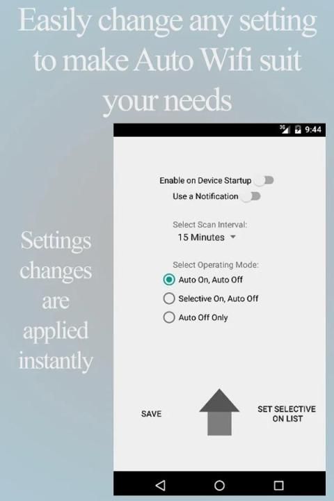 "Selective on, auto off" - this mode will only automatically turn your wifi on when your device can connect to an access point from a list that you select. Great for when you want your phone to connect to wifi at home but not at school or work. It will only shut your wifi off automatically when it isn't connected to anything, so you can still manually turn on your wifi without disruption.