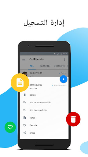 يمكنك تسجيل أي مكالمات واردة ومكالمات صادرة بجودة عالية. سيتم تخزين قائمة الملفات المسجلة وتبسيطها لك في مسجل المكالمات الهاتفية أثناء وجودك على الهاتف. مسجل المكالمات التلقائي مسجل المكالمات بسيط وأنيق لجميع هواتف أندرويد لتسجيل المكالمات الهاتفية بسهولة من كلا الجانبين مع صوت واضح في أي وقت. يمكنك إدارة ملفات التسجيل والاستماع إلى التسجيل وإضافة ملاحظات ومشاركتها. لا تقلق أبدًا بشأن فقدان تسجيلات المكالمات المهمة. يساعدك مسجل المكالمات المخفية أيضًا على تسجيل المحادثات المهمة سرًا. يوفر البرنامج عدد من الخيارات المختلفة والمتاحة لمستخدميه حيث يتم تسجيل المكالمات والاحتفاظ بها في ذاكرة الهاتف أو الذاكرة الخارجية بالإضافة الى ذلك يمكن الاختيار بين تسجيل كافة المكالمات بشكل تلقائي وهو الوضع الافتراضي للبرنامج أو عدم التسجيل على الإطلاق كما يمكن اختيار تسجيل مكالمات لأشخاص معينة باستخدام إصدار pro من برنامج مسجل المكالمات.