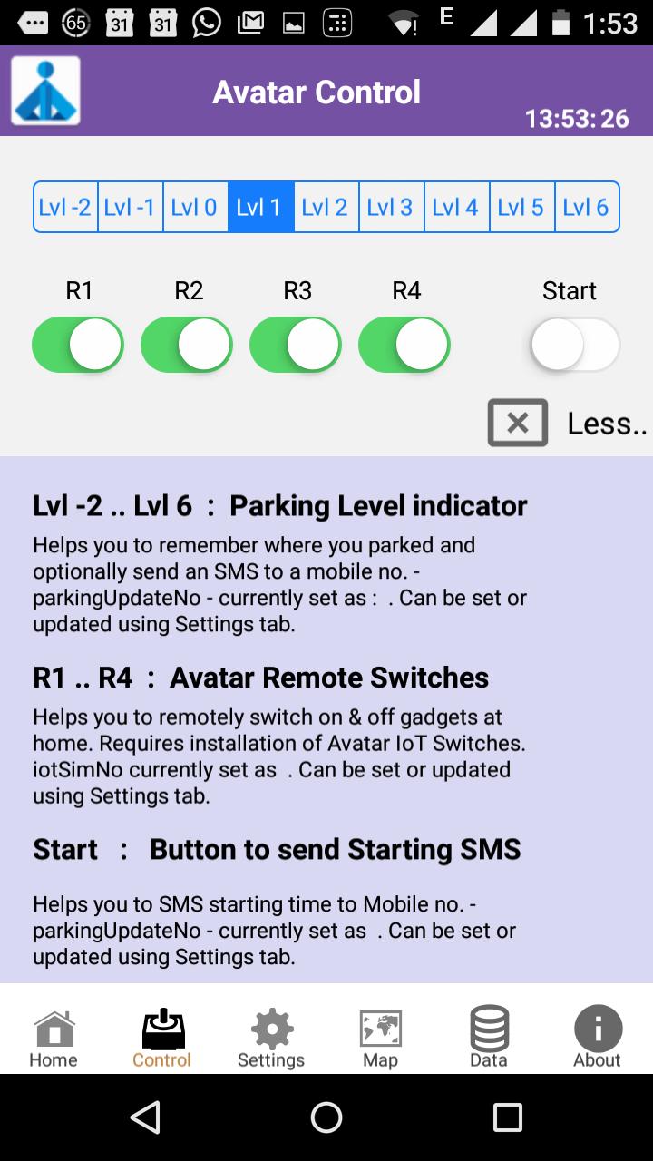 (3) Go to Control tab, Select a Parking level from Lvl-2 to Lvl6 and you should see a SMS dialogue pop up with the parking level & the mobile no. you have set.
