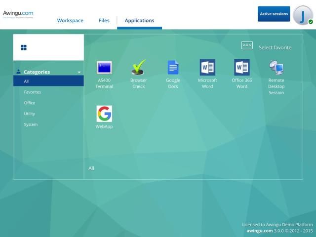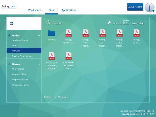 مكان العمل المركزي Awingu ليقدم حلا ملموسا لهذا الحراك المتزايد و "أحضر جهازك الخاص" (BYOD) الاتجاهات. Awingu هي عبارة عن منصة على شبكة الإنترنت، حيث يمكنك الحصول بسهولة الوصول إلى كل ما تبذلونه من الملفات والتطبيقات والبرمجيات. أفضل للجميع، يمكنك الاتصال من أي جهاز، نظام التشغيل أو المتصفح، من أي مكان في العالم. الشيء الوحيد الذي تحتاجه؟ إنترنت-اتصال!