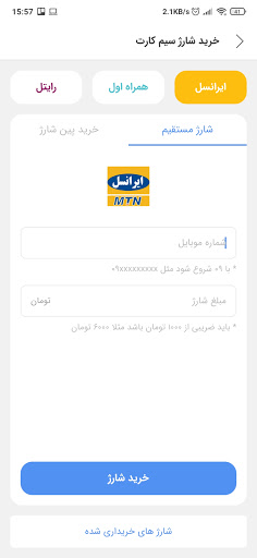 إمكانية شراء مجموعة متنوعة من شحن شركة إيرانسل، الأولى، RITEL، وكذلك شراء جميع أنواع حزم الإنترنت في إيران، وضعت