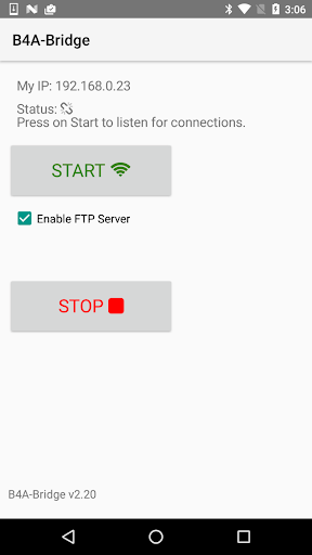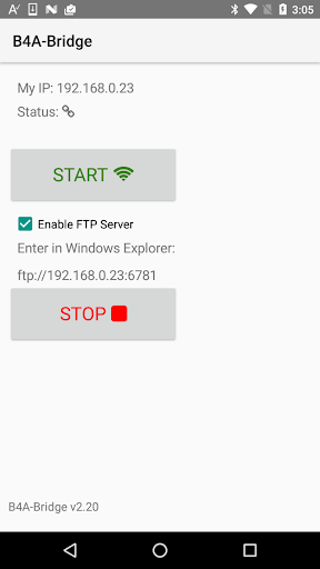 يشتمل B4A-Bridge على خادم FTP داخلي.يمكنك استخدامه لتصفح التخزين الثانوي (file.dirrootexternal) مع عميل FTP أو مستكشف Windows.
