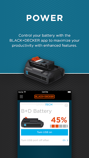 تقديم كل تطبيق أسود ديكر الجديد. يمكنك توصيل تطبيق Black Decker ™ إلى بطاريات Smartech ™ / SmartTech ™ عبر Bluetooth®. بمجرد الاتصال، يمكنك عرض رسوم البطارية الحالية أو تشغيل أو إيقاف تشغيل منفذ شحن USB أو تمكين البطارية أو تعطيلها وتحديد موقع البطارية عند فقدها.