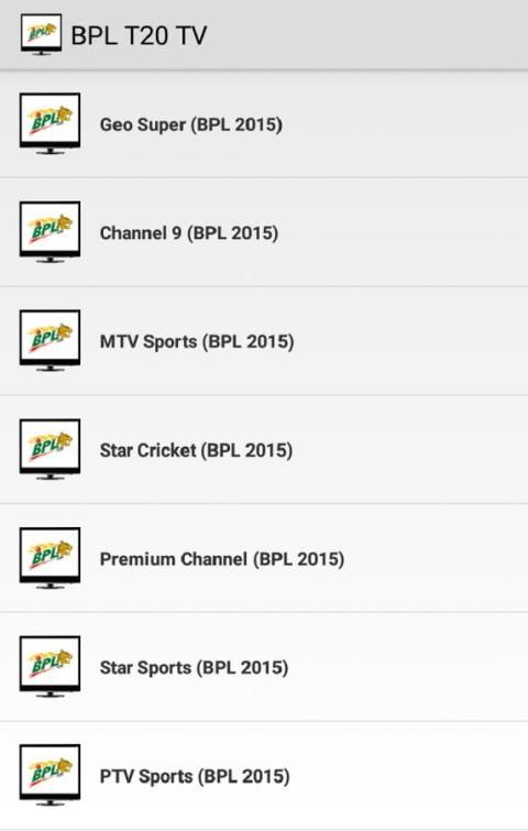 BPL T20 2015 Cricket TV app provides all the required information to watch Bangladesh Premier League BPL T20 2015 matches on your TV. BPL T20 2015 Cricket TV app enlists all the Free Cricket TV Channels broadcasting Bangladesh Premier League BPL T20 2015. These TV Channels are free and easy to configure using this app, enjoy BPL Cricket and don't forget to rate this app.
