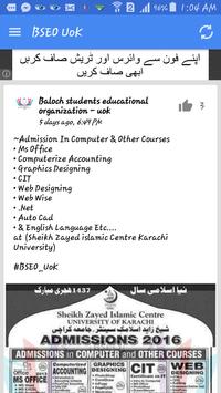 Baloch students used to make admission committees each year during admissions in past, similarly BSEO-UOK has made an admission cell, University of Karachi admissions 2016 (BSEO-UoK), for admissions 2016 in order to provide assistance to upcoming Baloch students for admission process. Admission Cell 2016 gives information about admission procedure, date of Test, Open Merit, Reserved Seats form submission, date of tests, format and sample papers of tests, results of tests, fee structure & closing percentage of all departments, counselling about admissions in different departments & faculties and reserved seats of Balochistan for graduation and