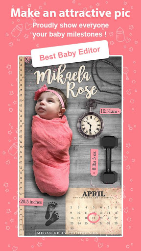 Baby Photo Editor is treasure to your precious pregnancy and baby milestone pictures by beautifully stickers and multiple personalized text.