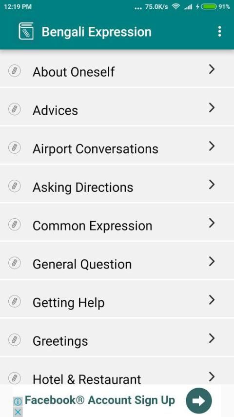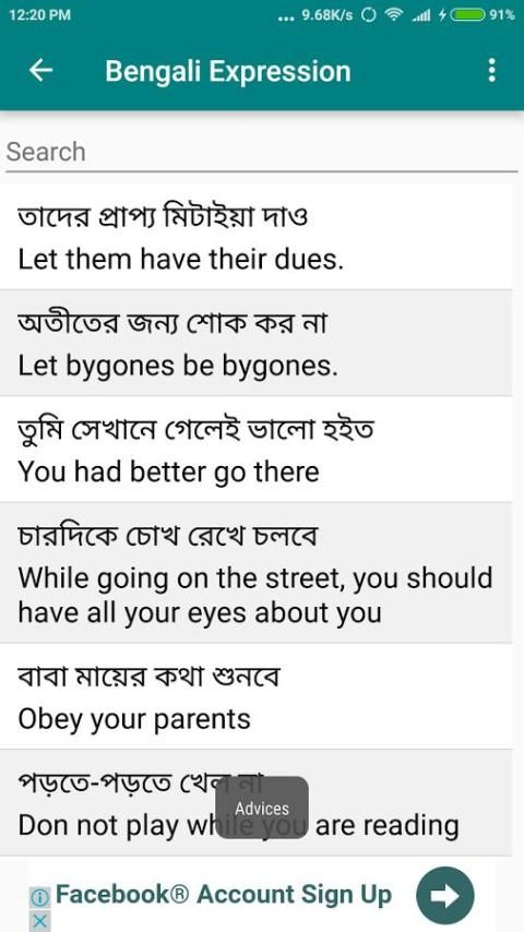 التعبير البنغالية (الترجمة البنغالية) هو تطبيق لتعلم اللغة التي توفر تعابير شائعة الاستخدام في مختلف الموضوعات مثل محادثة التسوق، محادثة المطار الخ هذا التطبيق يساعد على التحدث باللغة الإنجليزية والبنغالية اللغات.