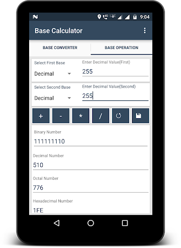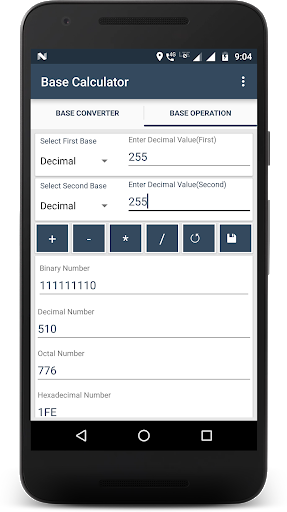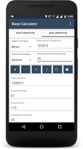 : يمكنك تنفيذ الإضافة ( ) أو الطرح (-) أو الضرب (X) أو قسم (/) على أي رقمين من نفسه أو قاعدة مختلفة.