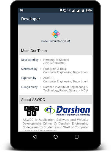 تم تطوير هذا التطبيق في ASWDC بواسطة Hemangi Santoki (130540107094)، طالب SEM 7 وبعد ASWDC هي التطبيقات والبرمجيات ومركز تطوير الموقع @ معهد دارشان للهندسة والتكنولوجيا، راجكوت يديرها طلاب وموظفي قسم هندسة الكمبيوتر