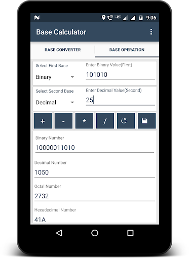 حاسبة قاعدة مرفق العمليات الرياضية مثل أي إضافة أساسية والطرح والضرب والقسمة. هنا عليك أن تدخل قيمتين في أي من القواعد ثم اضغط على زر التشغيل ( أو - أو * أو /) تريد القيام به. سيظهر النتائج في تنسيق ثنائي وثنائي، ثماني، ثماني وسد عشري.