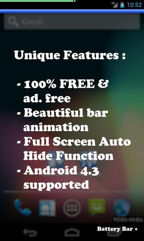 Battery Bar + is a FREE app for you to check out your device battery level with an animated colorful bar. It seamlessly integrates with the edge of the screen and run along with other application.