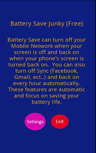 The free version of Battery Save Junky automatically turns your mobile network onoff with your screen, which saves a lot of precious battery life.Automatically sync your data every hour. NO MORE micro managing with widgets to SAVE battery life. Save money and data with Battery Save Junky, by using less data which means your using less batteryIdeas, suggestions and or feedback please email us peach.tree.appss@gmail.comBattery Save Junky saves your batterys life by turning offmobile network and sync i.e. Gmail, facebook ect... when youre not using your phone. FULL VERSION WiFi is made a priority as a default for those of you that have a home network Mobile network is second priority Everything is automatic and after you enable your new application, you dont have to micromanage your network connection anymoreIdeas, suggestions and or feedback please email us peach.tree.appss@gmail.comPro Version Now Available: Automated WiFi amp; Mobile Network Auto onoff with screenWiFi priority then mobile networkAuto GPS: GPS on with google maps and off when Maps closedMore Data sync intervals to save more battery lifeBattery indicator: Notifies battery level every hourNight Mode: Turns off everything except phone calls, between the hours of midnight and 6 amStay tuned for MORE FEATURES soonFOR FREE AND PRO VERSIONPlease note This application may not work on some devices and if this is the case then please contact us with your cell phone provider, device specifications, and the problem youre experiencing. We may give you a refund beyond the market39;s 15 minutes if we believe the problem cannot be fixed. If you have other battery saving applications, or task Killers this may interfere with Battery Save processes. In the case of Task Killers, please designate Battery Save on your Task Killers white list.