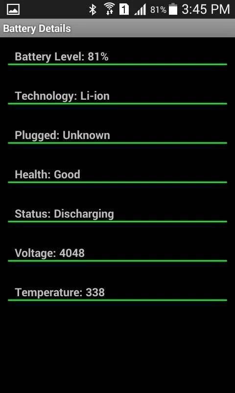 - شحن البطارية / التفريغ الرسم البياني - يظهر الرسم البياني شحن البطارية / التفريغ بحيث يمكن للمرء أن يلاحظ استخدام البطارية من استخدام المحمول لوقت معين.