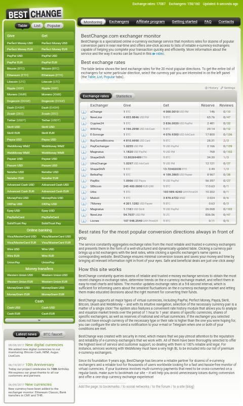 يمكنك أن تثق كل المبادلات المذكورة هنا. تحتوي على خدمة مراقبة BestChange.com فقط المبادلات موثوقة التحقق من قبل المسؤول لدينا. كل منهم لديهم مستويات عالية التجارية، واحتياطيات جيدة وخبرة كافية في مجال الصرف. قبل البدء في تبادل المال، ونحن ننصح الالتفات إلى المسبق لبرنامج يكون BL والكمال المال TS من المبادلات وعدد من التعليقات (يمكنك أن ترى في الطرف المعلومات)