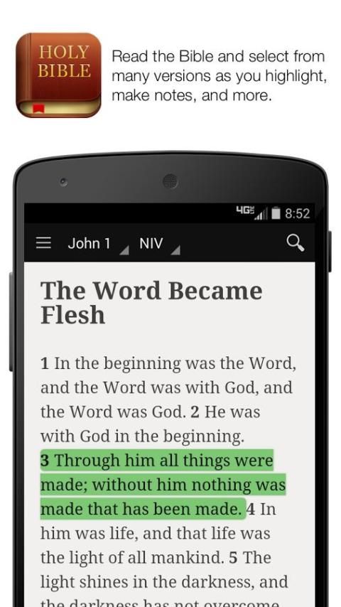 On more than 100 million devices all over the world, people are reading, listening to, and sharing the Bible using the Number 1 rated Bible App—completely free. Hundreds of Bible versions, hundreds of reading plans, dozens of languages. Add your own highlights, bookmarks, and public or private notes. Customize your reading experience. Access everything when you’re connected, or download specific versions for offline use. READ THE BIBLE * Set your Bible App’s interface for your choice of more than 30 languages. * Easily select from hundreds of Bible versions, in nearly 150 languages. * Choose from popular versions like the KJV, GNB, NIV and CEV * Offline Bibles: Read even without network access. * Listen to audio Bibles as you do other tasks. (Audio Bibles not downloadable.) STUDY THE BIBLE * Hundreds of reading plans: Devotionals, topical plans, portions of the Bible, or the whole thing. * Many reading plans are even available in multiple languages. * You’ll find devotionals, as well as plans that lead you through specific topics, portions of the Bible, or even the entire Bible. * Search the Bible using keywords. CUSTOMISE YOUR BIBLE * Highlight with custom colours—just like a paper Bible. * Share verses with friends using social networks, email, or text. * Bookmark passages: Share, memorise, or just keep track of your favourites. * Add notes to passages: Keep them private so only you can see them, or make them public to share with friends. * With a free YouVersion account, see all of your notes, highlights, bookmarks, and reading plans on any supported device. * Read easier with settings like fonts, text size, and contrast for bright or low-light conditions. YOUR PRIVACY ON ANDROID * The Bible App requests access to your phone calls in order to pause audio playback if you're listening to a Bible when a phone call comes in. * The Bible App requests read/write access to your SD card because that's where Bibles are downloaded and stored if you choose to do so. * The Bible App requests access to your account list to help the signup process go more smoothly. If you choose to sign up with an account connected to your device, you can skip the verify step. * We do not sell any personal information you provide us, nor will we share it without your consent. You can read our privacy policy at http://youversion.com/privacy. CONNECT WITH YOUVERSION * Contact support from directly inside the Bible App. * Like us on Facebook: http://facebook.com/youversion * Follow us on Twitter: http://twitter.com/youversion * Catch up on the latest on our blog: http://blog.youversion.com * Use YouVersion online: http://bible.com Download the world’s Number 1 Bible App now and enjoy the Bible reading experience loved by millions!