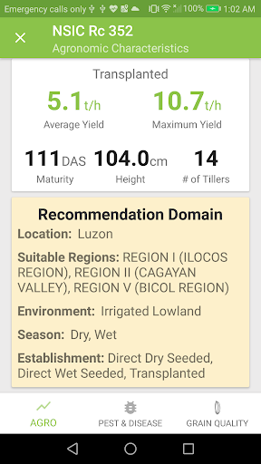 • Rice variety characteristics – Each rice variety comes with full descriptions of their maximum and average yields, maturity, height, number of tillers, recommended domain (season, region, and mode of crop establishment), resistance to pests and diseases, milling potential, physical attributes, and physicochemical characteristics. With these, you can make informed decisions about which rice variety you will use.