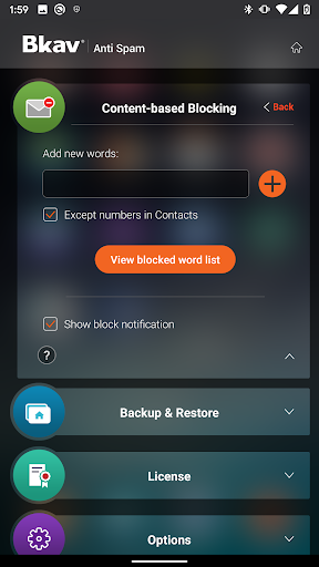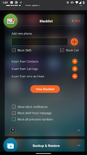 - حظر الرسائل القصيرة والمكالمات بناء على أرقام أو كلمات رئيسية موجودة في الرسائل القصيرةمحتوى.
