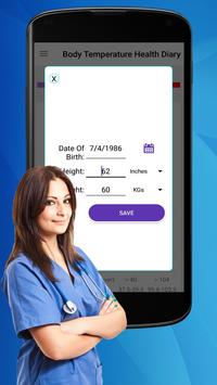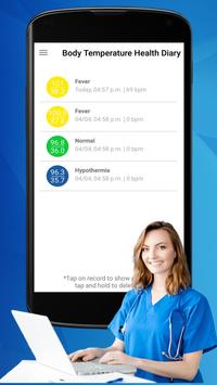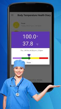 تمنحك معلومات تطبيق قياس درجة حرارة الجسم الحد الأقصى والحد الأدنى لنطاق القيم المعطاة في التطبيق لتخزين السجلات السابقة وتمنحك معلومات حول درجة حرارة جسمك والتي يتم تقديمها وفقًا لمقياس الحرارة.