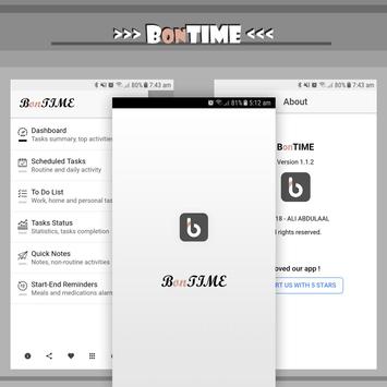 صمم تطبيق BonTIME ليكون ملائمًا و قادرًا على مساعدتك في تنظيم وقتك و اداء المهام اليومية بشكل سهل جدًا من خلال العديد من الخيارات و المميزات التي تسمح لك بإنجاز أعمالك في الوقت المناسب و استغلال اوقات فراغك باشياء اخرى مفيدة