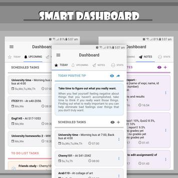 - Dashboard : لعرض المهام اليومية و القادة ، و ايضا ملخص رسومي لعدد المهام حسب الاسبوع و عدد المهام التي يجب عليك انجازها