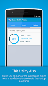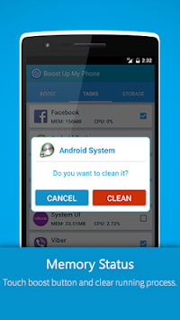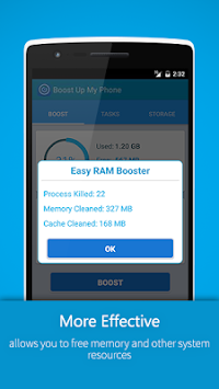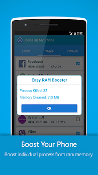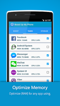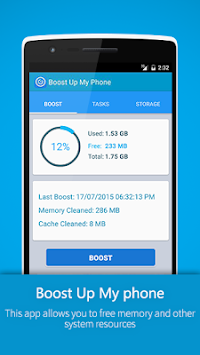 What you are waiting for? May the Boost Up My Phone be with you!boost your RAM with single touch. Touch boost button and clear running process. In Tasks tab you can swipe to clean individual process from ram memory. In more tab you also know about your internal and external memory status.