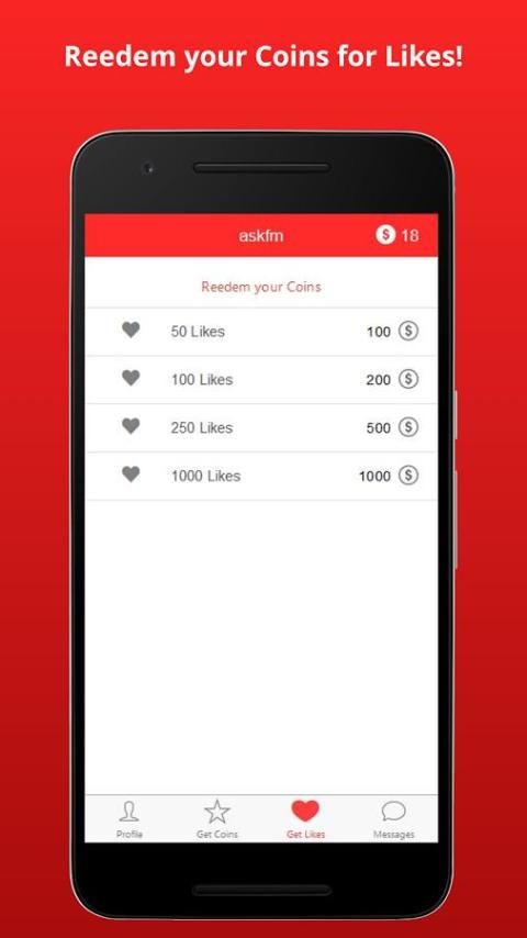 أفضل طريقة للحصول على إعجاب على askfm. يمكنك الحصول على الكثير من askfm يحب مع هذا التطبيق. كل ما عليك القيام به هو جمع القطع النقدية، وreedem لهم للإعجاب. وسوف تحصل على تسليمها على الفور!