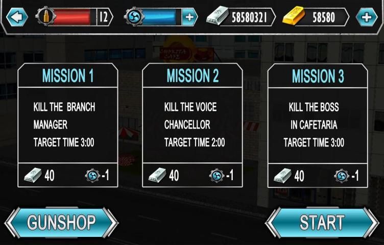 كل بعثة لديها سيناريو مختلفا الذي يجعل اللعبة فريدة من نوعها وتحديا ولكن التركيز الرئيسي الخاص بك هو قتل المستهدف دون الفشل المستوى.