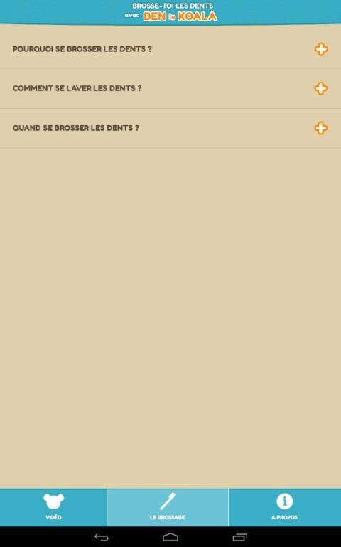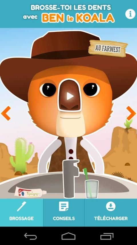 يختار الطفل شخصيته ويبدأ شريط الفيديو الذي يظهر الحرف في عملية تنظيف الأسنان. A الموقت تشير إلى مقدار الوقت يمر خلال تنظيف الأسنان بالفرشاة وتسمح للطفل لرصد النشاط واستباق الإجراءات.