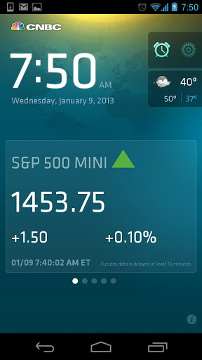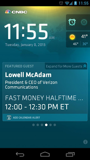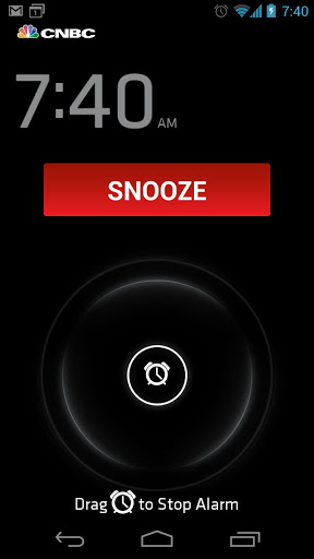 In the financial markets, time is money. Now you can wake up with the CNBC Alarm clock app and get your business news bearing instantaneously. Choose your favorite CNBC anchor, and you’ll get the state of the S&P in their very own words as your alarm. Top News, TV segments you might have missed, and comprehensive market data all on your bedside table. You’ll also have the list of upcoming guests so you can set alerts to remind you when they’ll be on. Can’t turn the TV on fast enough in the morning? Now Becky Quick, Joe Kernen, or Andrew Ross Sorkin can let you know what’s going on from the get-go. If you need Jim Cramer screaming BUY BUY BUY to get you out of bed, that’s available too. Choose from over 17 CNBC personalities. With a simple swipe, you’ll access current top business news stories top videos, and all the market data you need to capitalize on the day.Features - Wake up with your favorite CNBC anchor telling you the status of the S&P 500 or S&P Futures - Choose any combination of alarm sound and CNBC anchor to wake you up, or choose Shuffle to hear a random combination each time - Set your desired Snooze time - Set alarms to repeat on certain days of the week - Support for multiple alarms - Set a calendar alert to remind you to tune in when your favorite guests are scheduled to appear - View current weather conditions, temperature high and low Swipe through panels to see: - S&P 500 or S&P Futures market data - CNBC Market Update - CNBC Top News - Upcoming guests on CNBC - CNBC Top Video - NBC News Top Story