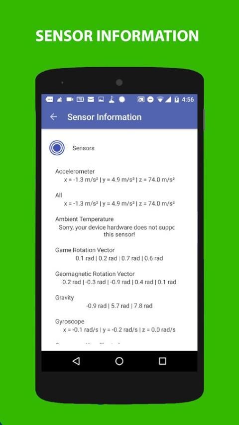 - الحصول على قراءات على كل أجهزة الاستشعار المدمجة في الهاتف الذكي الخاص بك.