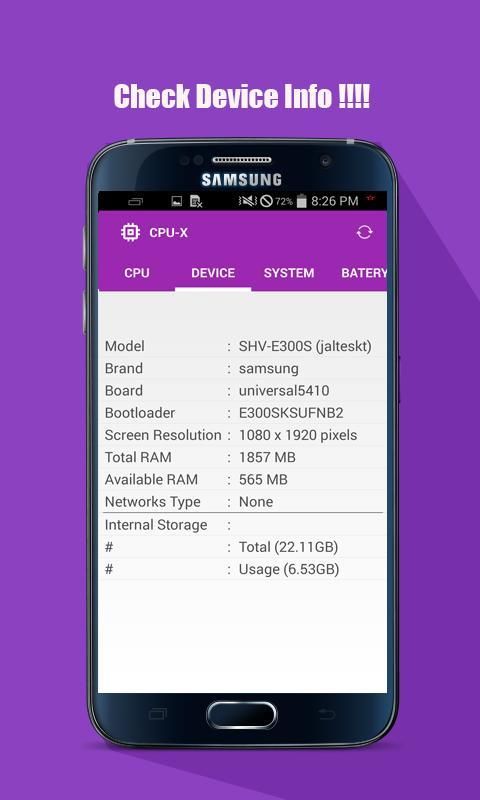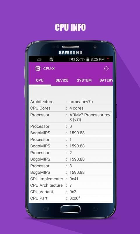 CPU-X is a free utilities app. CPU-X show information about your phone, like CPU, System, Device, Battery, and Sensor information.